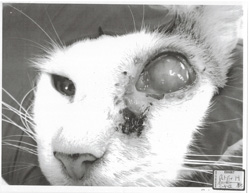 Exhibit 14 chronicles the treatment of Cat #029, a male cat with an upper respiratory infection so severe that he is now completely blind. This cat's right eye had a mature cataract. The left eye had an enlarged cornea and conjunctivitis, with pus and discharge present, and a yellow abscess on the eyelid.